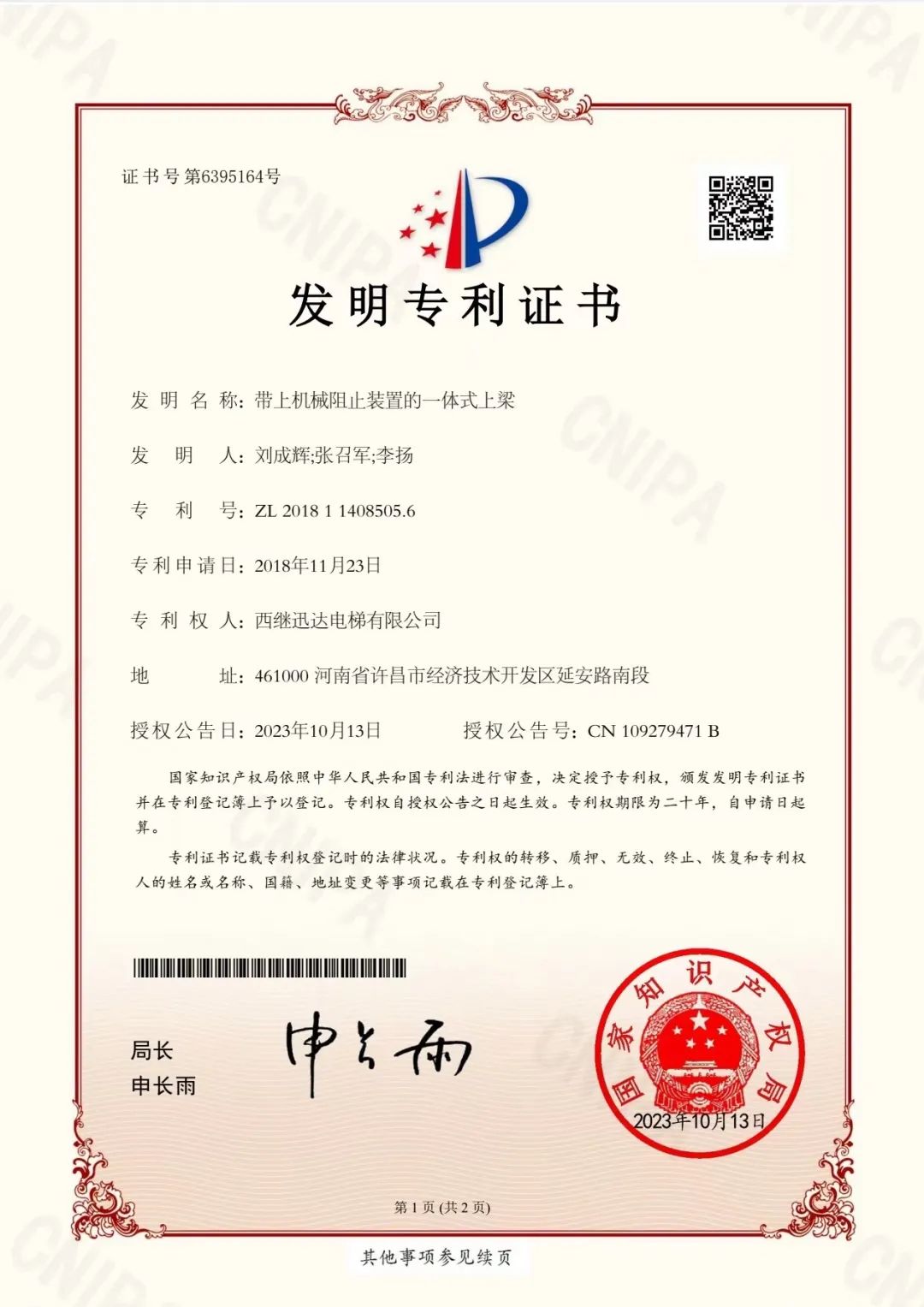 10月13日,西繼迅達自主研發的技術成果——帶上機械阻止裝置的一體式上梁,喜獲國家知識產權授權的發明專利證書。此外,一種電梯驅動的制動器電磁力測試裝置和背包式電梯導向系統兩項創新技術,于8月29日同一天獲得國家知識產權局正式授權的發明專利證書。新獲得的三項國家發明專利,為西繼迅達科技創新能力再添嶄新名片。