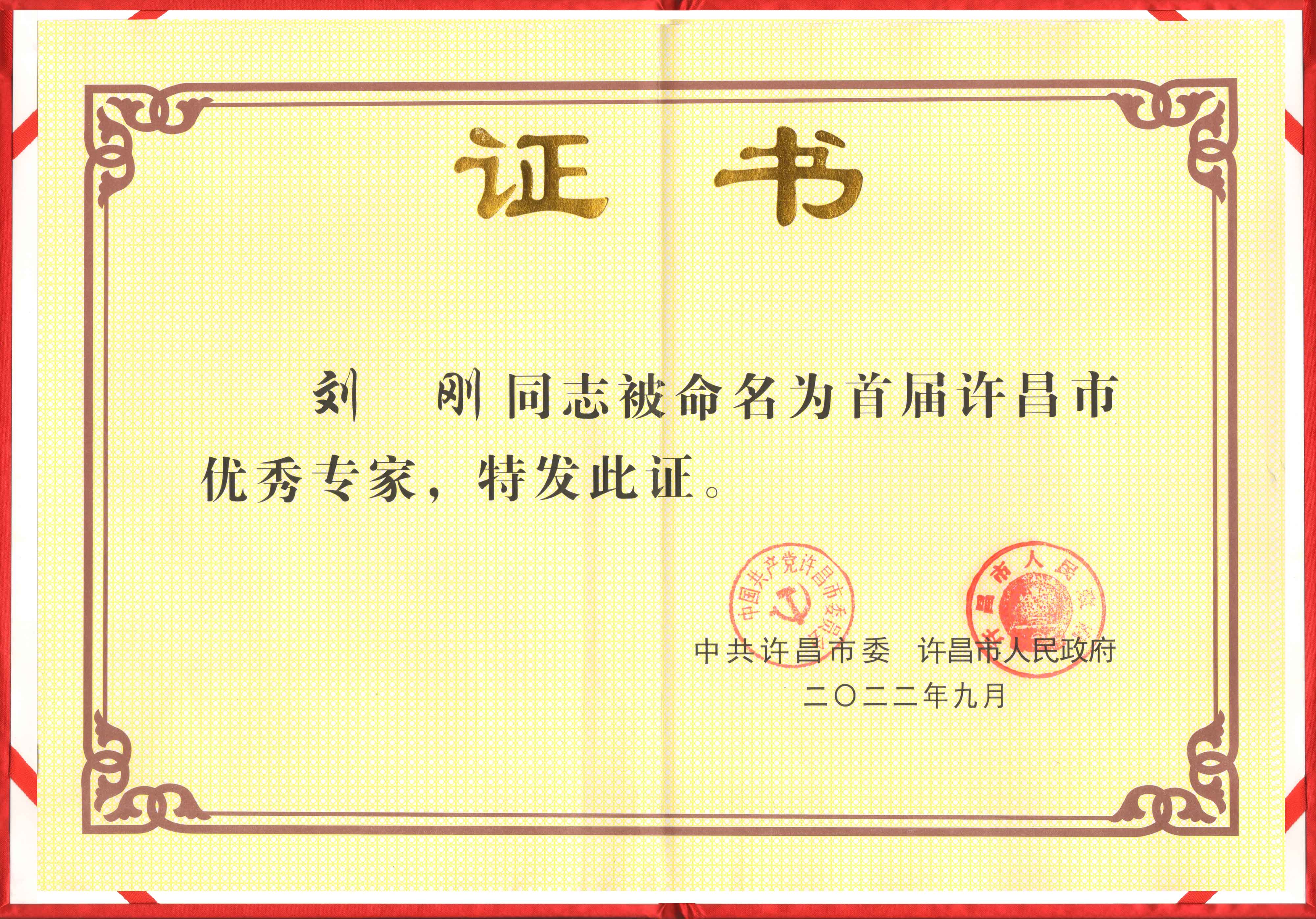 9 月 14 日,公司總經理劉剛在許昌市委人才工作會議上,被授予“首屆許昌市優秀專家”稱號。