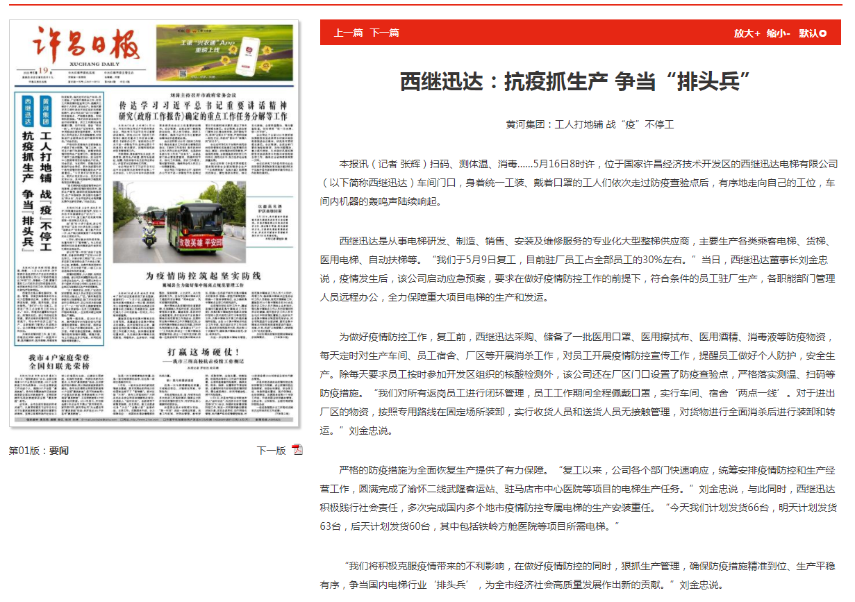 5月19日,《許昌日?qǐng)?bào)》頭版頭條發(fā)布稿件:西繼迅達(dá):抗疫抓生產(chǎn)爭(zhēng)當(dāng)“排頭兵”,對(duì)公司疫情防控和復(fù)工復(fù)產(chǎn)情況進(jìn)行報(bào)道,在僅有30%駐廠員工的情況下,仍然圓滿保障了眾多重點(diǎn)項(xiàng)目的生產(chǎn)發(fā)運(yùn)工作。