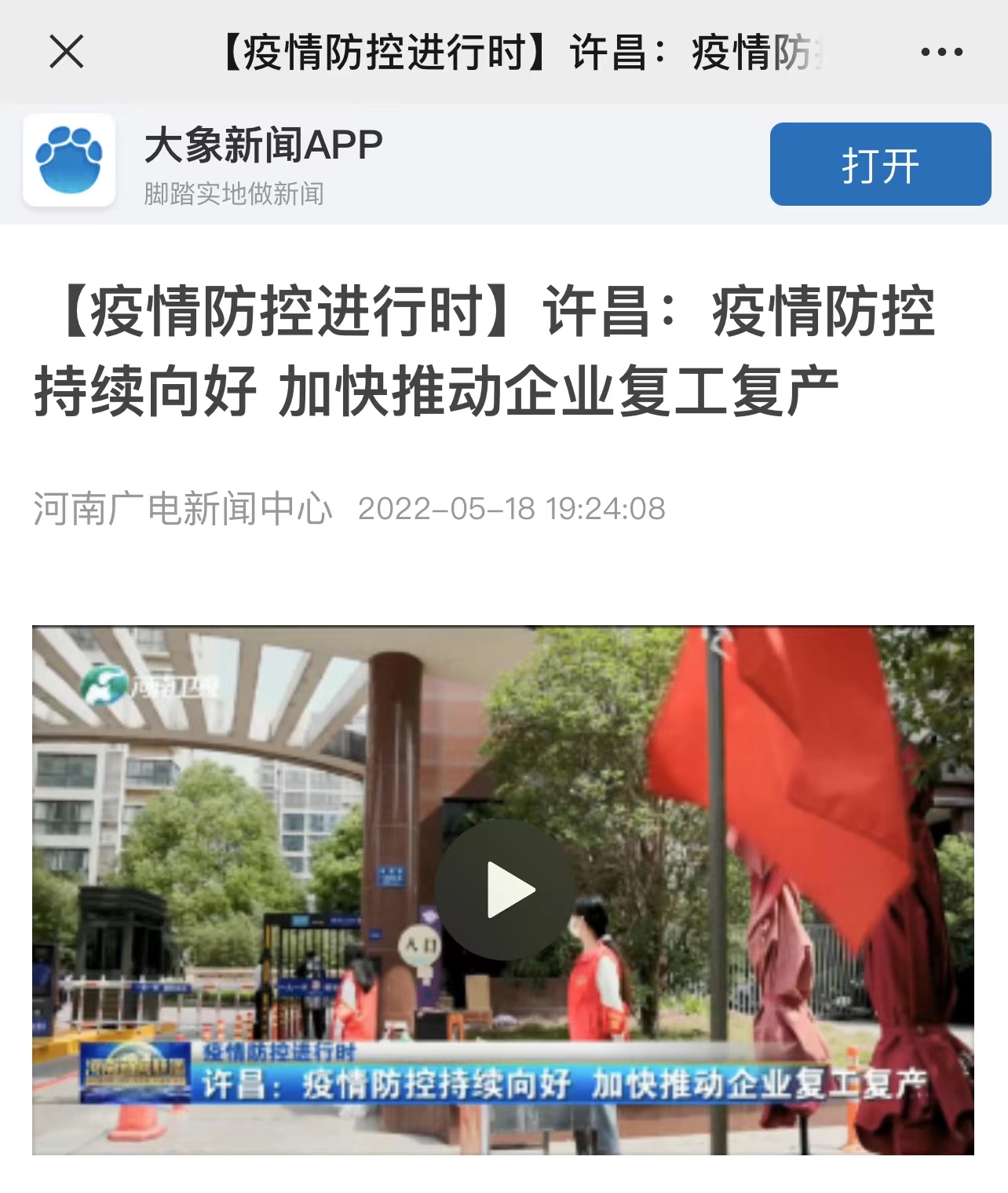 5月18日,《大象新聞》河南廣電新聞中心推送許昌:疫情防控持續(xù)向好 加快推動(dòng)企業(yè)復(fù)工復(fù)產(chǎn)的新聞報(bào)道。