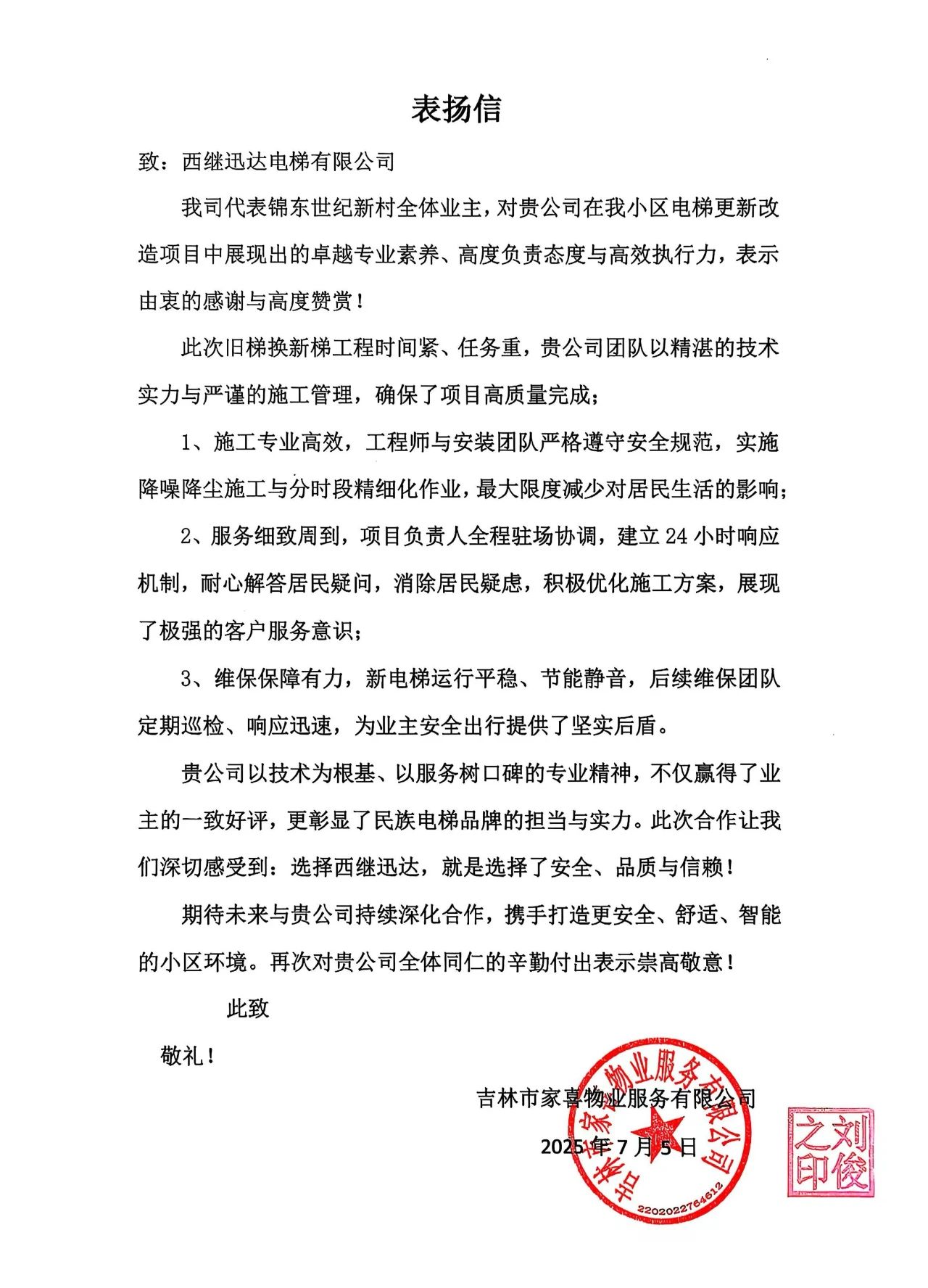 一封來自吉林舊梯改造項目的表揚信