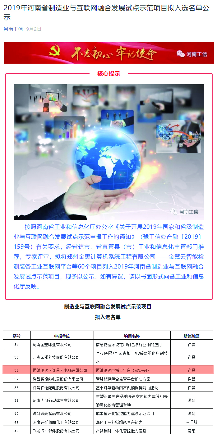西繼迅達eCloud電梯云平臺入選省制造業(yè)與互聯(lián)網(wǎng)融合發(fā)展試點示范項目