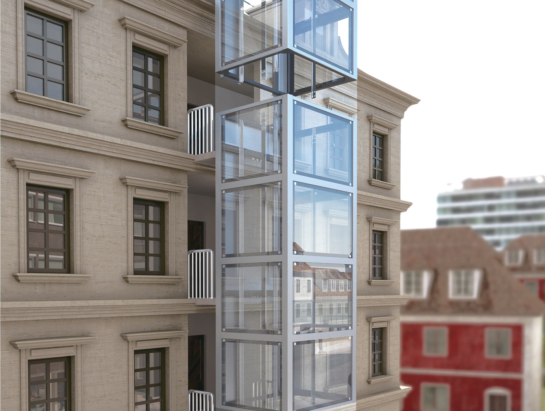 Back balcony access, direct access to the target floor, compact close to the building, link platform type